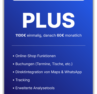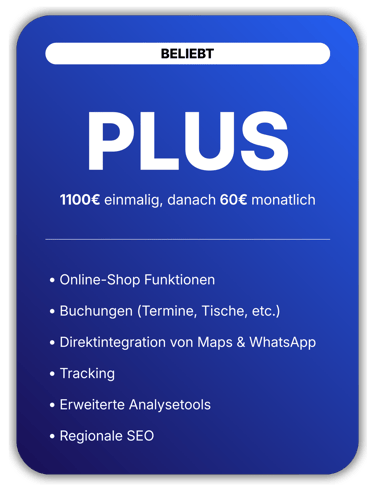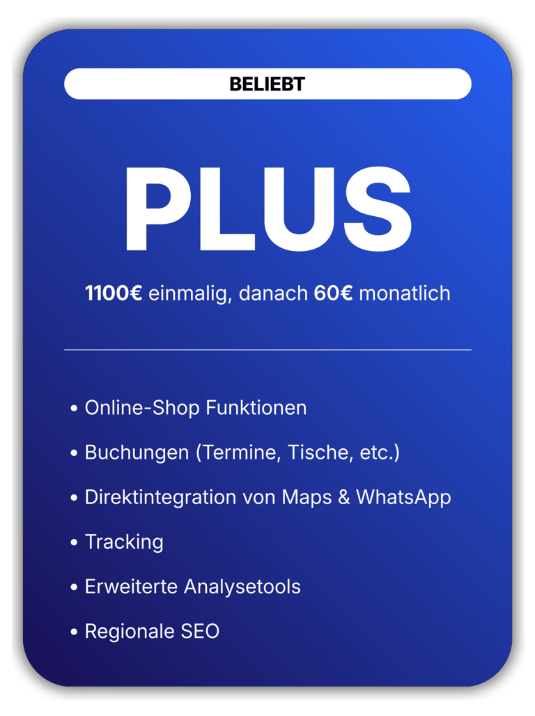 Das Webdesign-Plus-Paket richtet sich an wachsende Unternehmen, die mehr als nur eine Online-Präsenz möchten. Ideal für Betriebe, die aktiv Kunden gewinnen, Prozesse digitalisieren und ihre Reichweite steigern wollen – mit Fokus auf Interaktion, Automatisierung und regionale Sichtbarkeit.