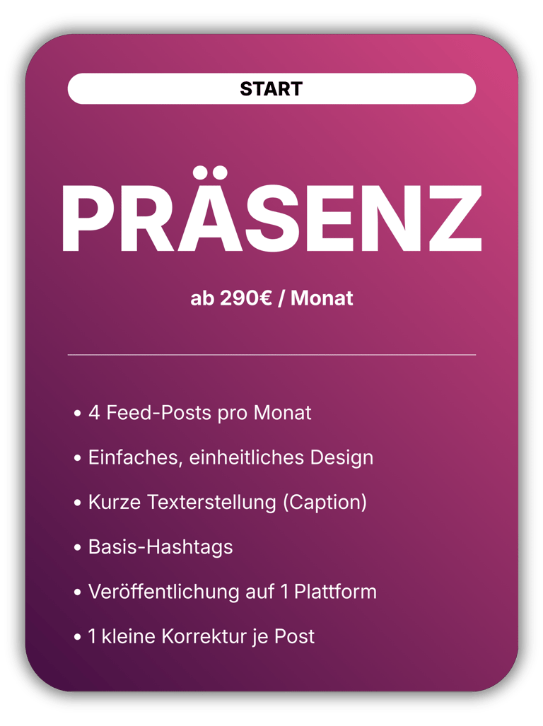 Das Präsenz-Paket ist ideal für Unternehmen, die regelmäßig auf Social Media auftreten möchten, ohne sich selbst um Planung, Gestaltung und Veröffentlichung kümmern zu müssen.